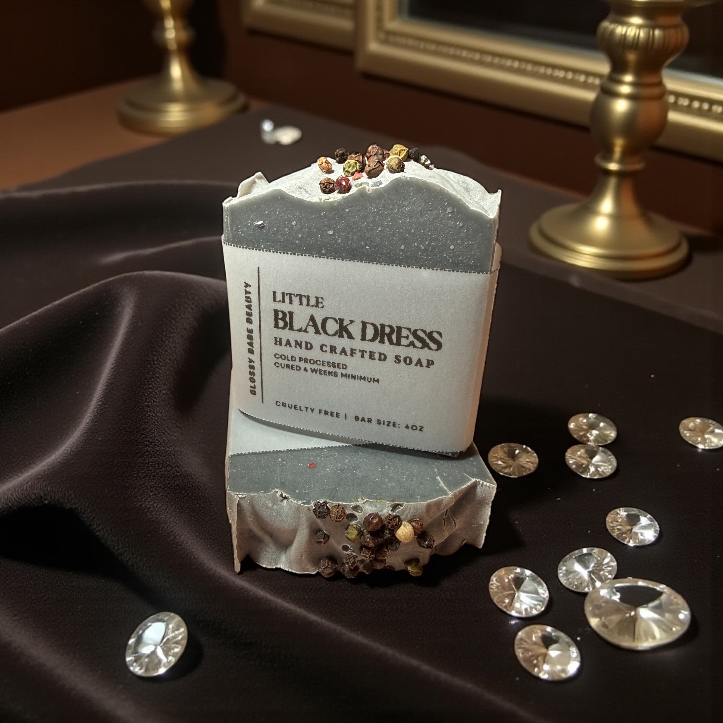 Slip into sophistication with Little Black Dress — a sleek, luxurious cold process soap designed to make every wash feel effortlessly refined. Infused with a beautifully balanced fragrance (feminine yet musky), this bar features a deep, velvety color from activated charcoal and a sparkling finishing touch: peppercorns sprinkled on top to resemble jewels.